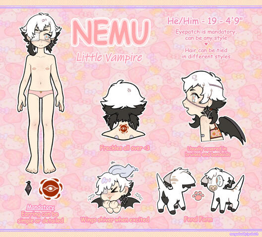Born in Belarus, he was trafficked into japan at age 7. For 10 years he was held as a sex slave by a cult, and forcibly turned into a vampire. being sold for sex to wealthy customers who wanted the thrill of the supernatural. nemu was feral throughout this time, barely speaking, in a blood starved and terrified permastate. he was the longest living vampire, watching any other prisoners he felt kinship with succumb to their starvation.two years before current events the cult kidnapped the husband of a powerful dog demon lord. (details exactly not important for nemu)
